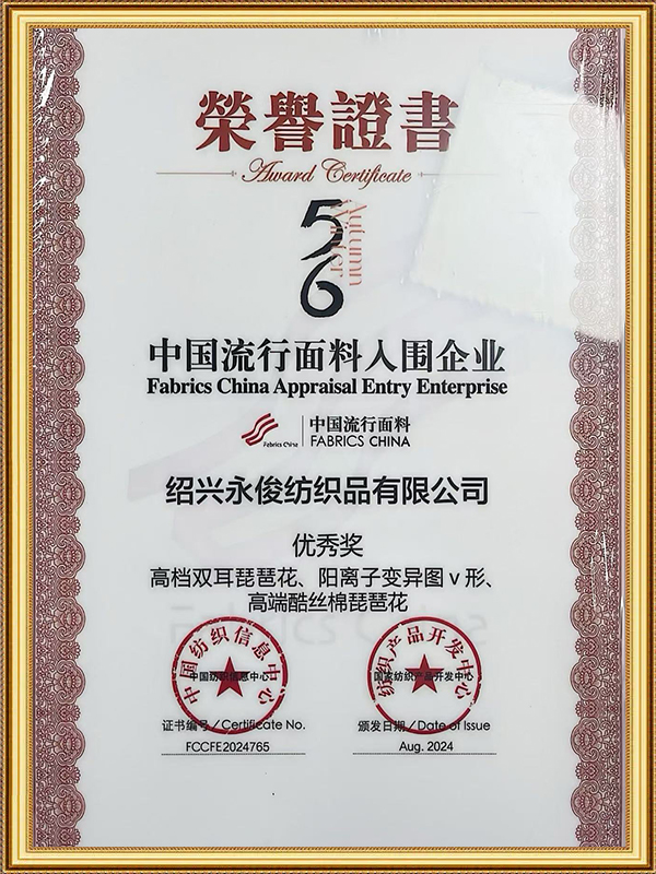 이 회사는 안감 및 여성용 직물의 생산 및 개발을 전문적으로 운영하며 고객 요구를 충족시키기 위해 다양한 품질 표준을 확립했습니다. 2006년에 "용준" 브랜드를 등록하였고, 2018년에 "징준", "위에두" 브랜드를 등록하였습니다. 회사는 고객의 요구와 시장 동향에 부응하여 수주생산에 중점을 두고 연구개발을 하고 있습니다. 원사 및 회색 천 운영을 통해 무역과 생산을 통합함으로써 회사는 공급 능력이 제약되지 않도록 보장합니다.